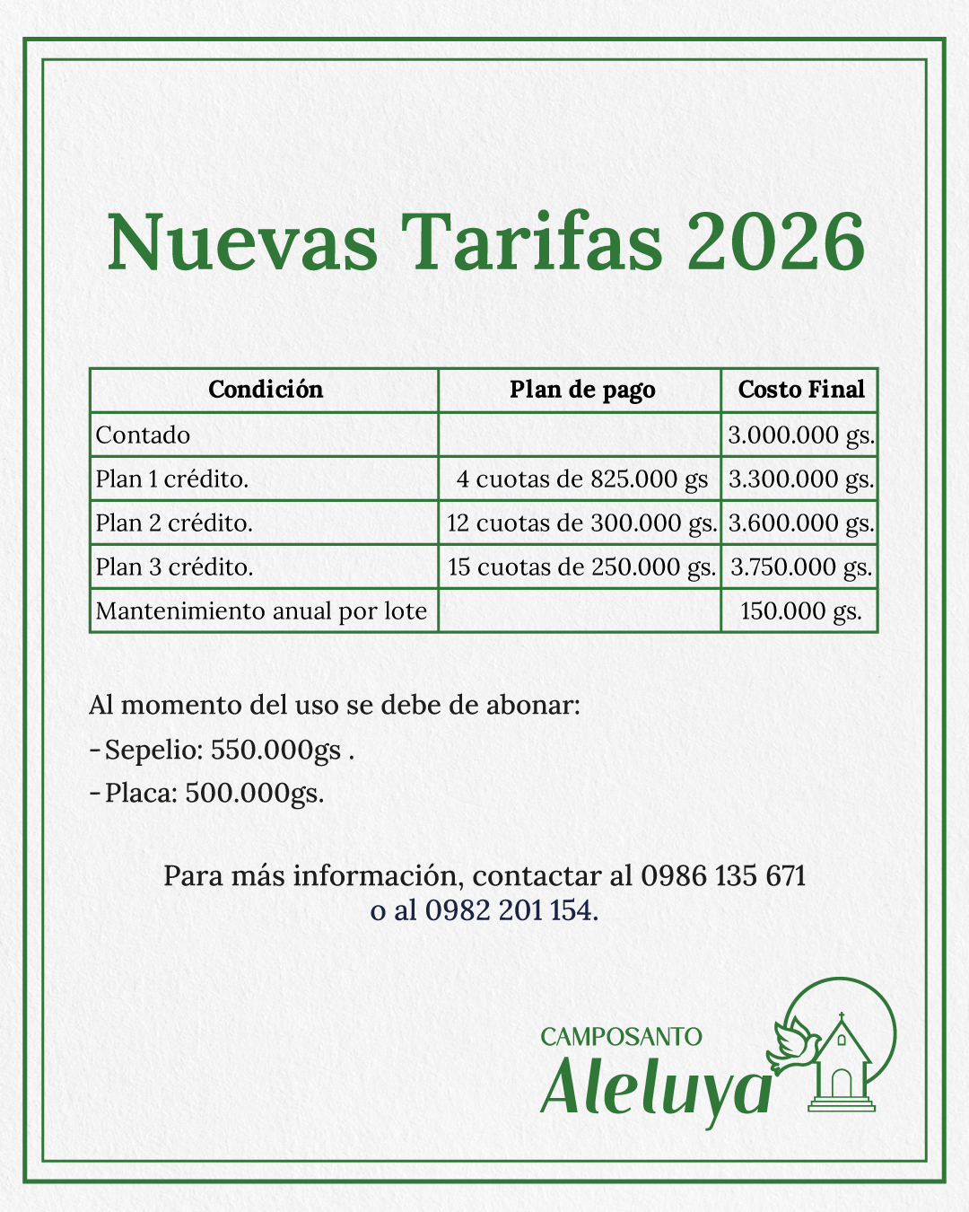 Para más informaciones sobre como acceder a nuestro Campo Santo, podés comunicarte con nosotros a los siguientes contactos. Con gusto te guiaremos en el proceso.